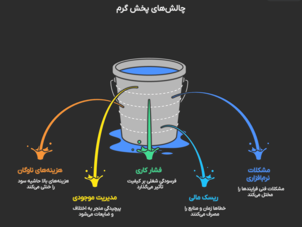 هزینه ناوگان و توقف‌های متعدد، مدیریت موجودی هر خودرو و تاریخ انقضا، فشار کاری روی ویزیتور و موزع، ریسک مالی در جمع‌آوری وجوه و چک‌ها، و در نهایت محدودیت‌های زیرساختی و نرم‌افزاری، مهم‌ترین چالش‌هایی هستند که مدیران پخش گرم در ایران با آن روبه‌رو می‌شوند.